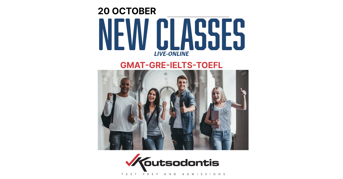 Νέα τμήματα IELTS, GMAT, GRE & TOEFL ξεκινούν την Δευτέρα 20 Οκτωβρίου. Μπορείς να παρακολουθήσεις τα μαθήματα είτε με φυσική παρουσία στο Κέντρο μας, είτε online-live.