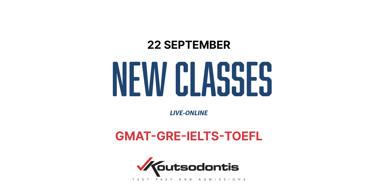 Νέα τμήματα IELTS, GMAT, GRE & TOEFL ξεκινούν την Δευτέρα 22 Σεπτεμβρίου. Μπορείς να παρακολουθήσεις τα μαθήματα είτε με φυσική παρουσία στο Κέντρο μας, είτε online-live.