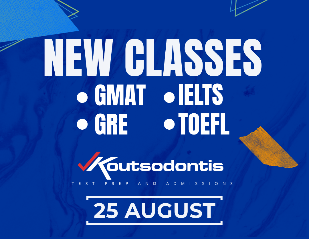 Νέα τμήματα IELTS, GMAT, GRE & TOEFL ξεκινούν την Δευτέρα 25 Αυγούστου. Μπορείς να παρακολουθήσεις τα μαθήματα είτε με φυσική παρουσία στο Κέντρο μας, είτε online-live.
