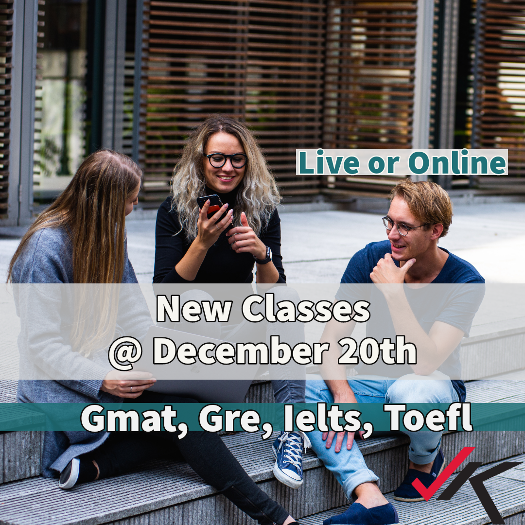 Νέα τμήματα GMAT, GRE, IELTS και TOEFL ξεκινούν τη Δευτέρα 20 Δεκεμβρίου 2021.Μπορείτε να παρακολουθήσετε τα μαθήματα είτε με φυσική παρουσία στο κέντρο μας, είτε online- live.